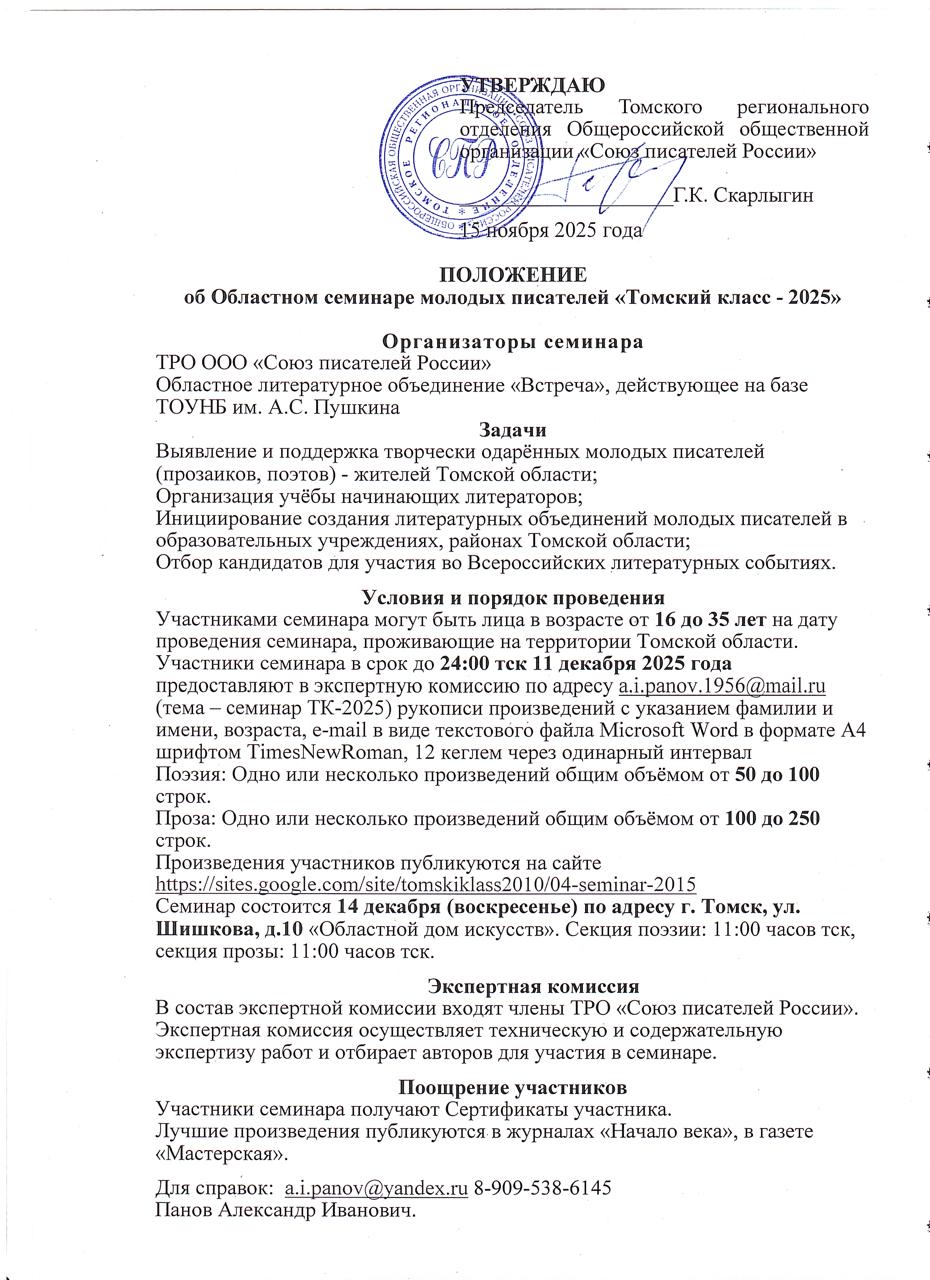 Участники семинара в срок до 24:00 тск 11 декабря 2025 года предоставляют в экспертную комиссию по адресу a.i.panov.1956@mail.ru (тема – семинар ТК-2025) рукописи произведений с указанием фамилии и имени, возраста, e-mail в виде текстового файла Microsoft Word в формате А4 шрифтом TimesNewRoman, 12 кеглем через одинарный интервал