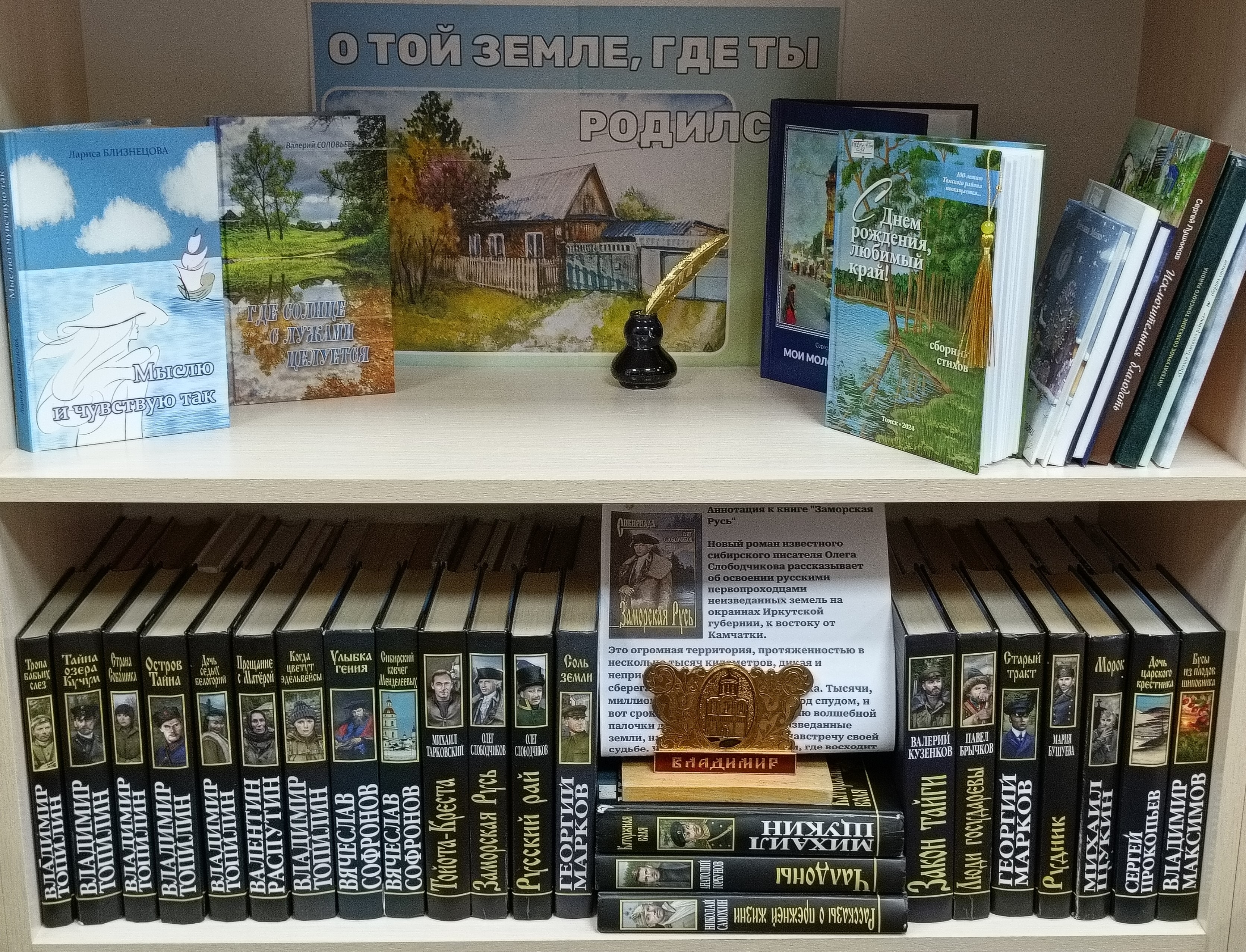 Выставка под названием «О той земле, где ты родился» представляет собой собрание произведений местных авторов, вдохновленных красотой сибирской природы и историей родного края. Здесь сборники стихов, многие из которых подписаны автографами самих поэтов. Особенно приятно, что на выставке представлены стихи наших односельчан.