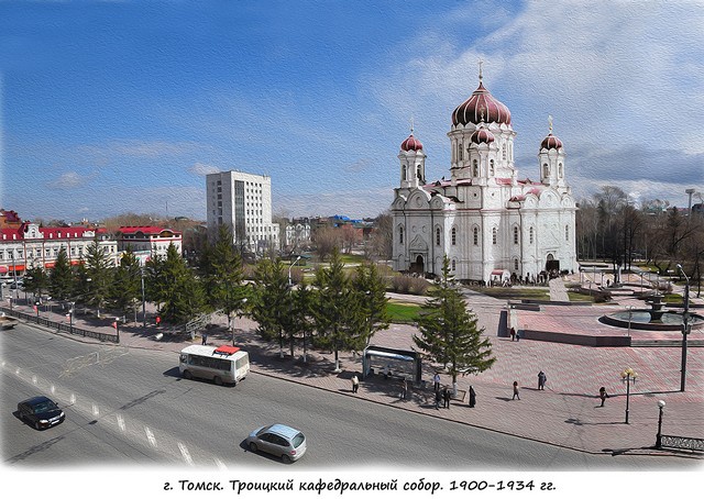 Профессор ТПУ Юрий Черданцев в своем проекте «Томск. Исчезнувшие храмы города» на фото воссоздал виды Томска с утраченными храмами, в том числе, конечно, и вид с Троицким собором. Посмотрите, какая величественная красота!
