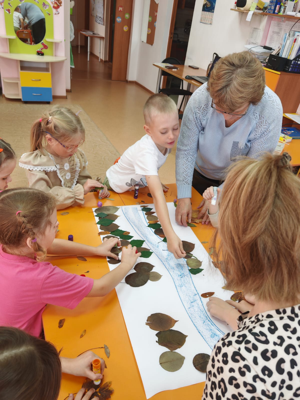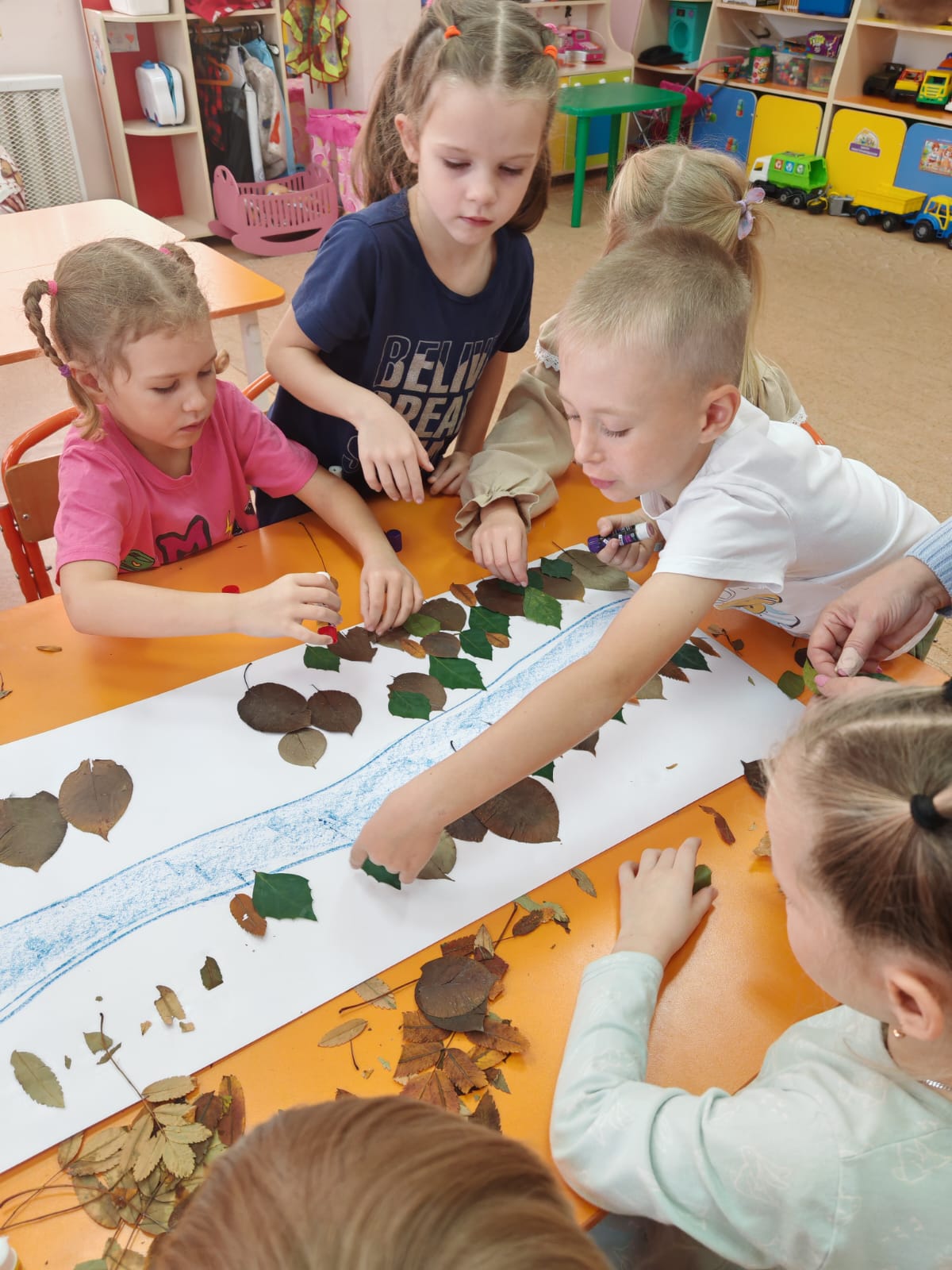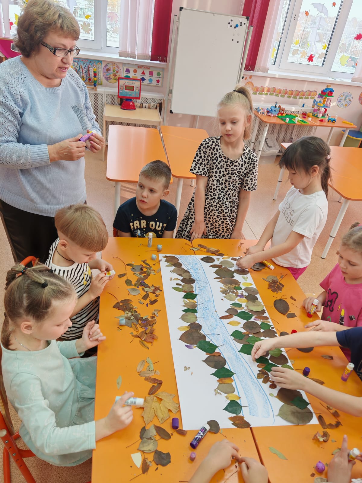 Ребята с огромным старанием приступили к работе. Сначала нарисовали реку и обозначили, где будет находиться лес. Каждый ребенок аккуратно наклеивал листочки на лист ватмана. В итоге получилась отличная осенняя картина, которая украсила группу. В завершение мастер-класса посмотрели цикл развивающих мультфильмов про осень.
