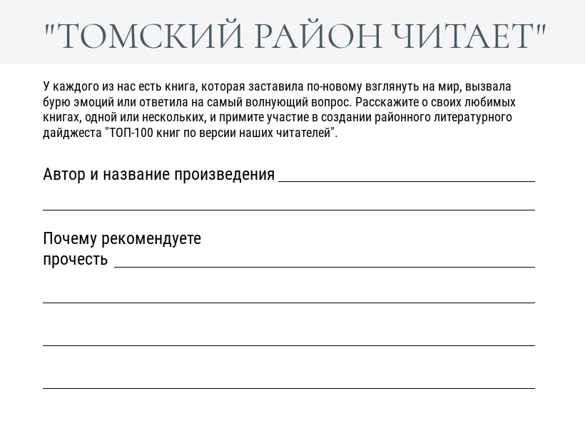 Уважаемые коллеги, в конце 2026 года мы планируем выпустить литературный дайджест «Томский район читает». В октябре месяце Вам необходимо начать опрос своих читателей, какие прочитанные книги больше всего запомнились, оказали влияние, чему-то научили.