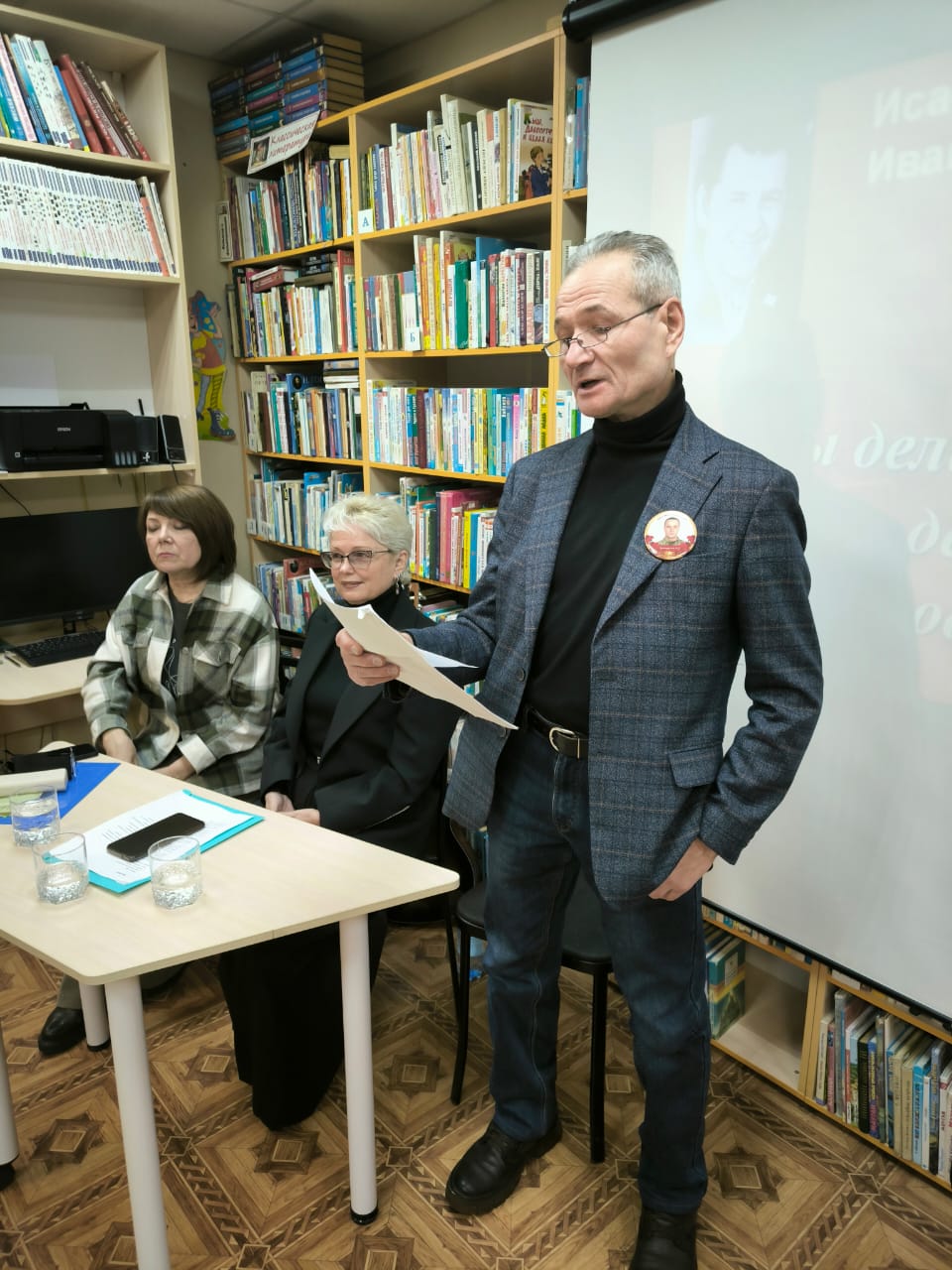 Литературный вечер завершился вручением подарков библиотеке. От брата поэта - Алексея Александровича Исаева - библиотеке передали три издания книг Ивана Исаева - «А я возьму и не умру», «Песни жаворонка. Утренняя», «Песни жаворонка. Вечерняя».
